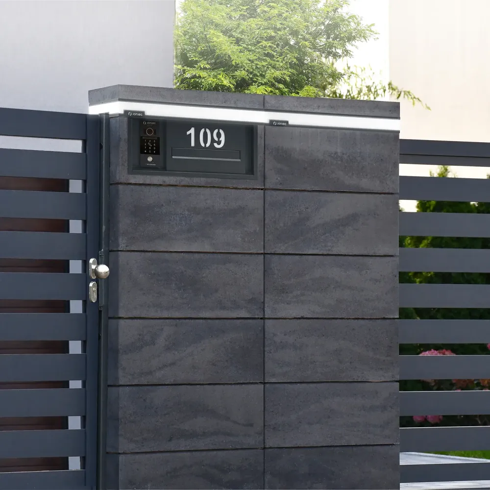 Model Smart to kompleksowe rozwiązanie łączące w sobie funkcjonalność lampy LED BLOCK i skrzynki na listy z wideodomofonem. Dzięki precyzyjnemu dopasowaniu do rozmiarów bloczków modułowych JONIEC®, lampa idealnie komponuje się ze słupkami. Podobnie jak cała reszta rodziny LED BLOCK model ten posiada wersję Light oraz Multi różniące się ze względu na oferowane formy oświetlenia.