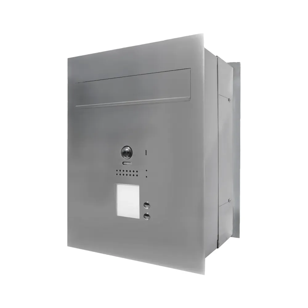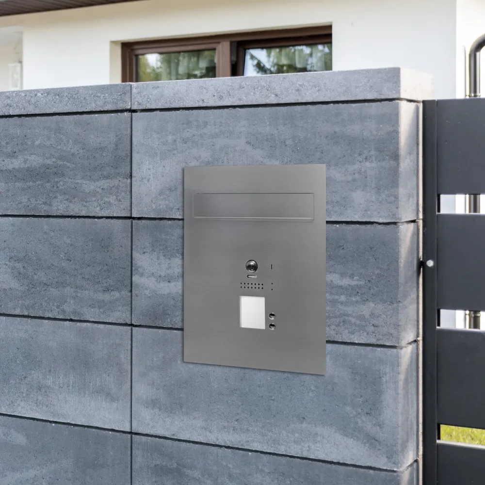 Przelotowa skrzynka na listy z wideodomofonem, czytnikiem RFID i dwoma przyciskami do montażu w bloczkach ogrodzeniowych i murach o głębokości od 19 do 25,5 cm.