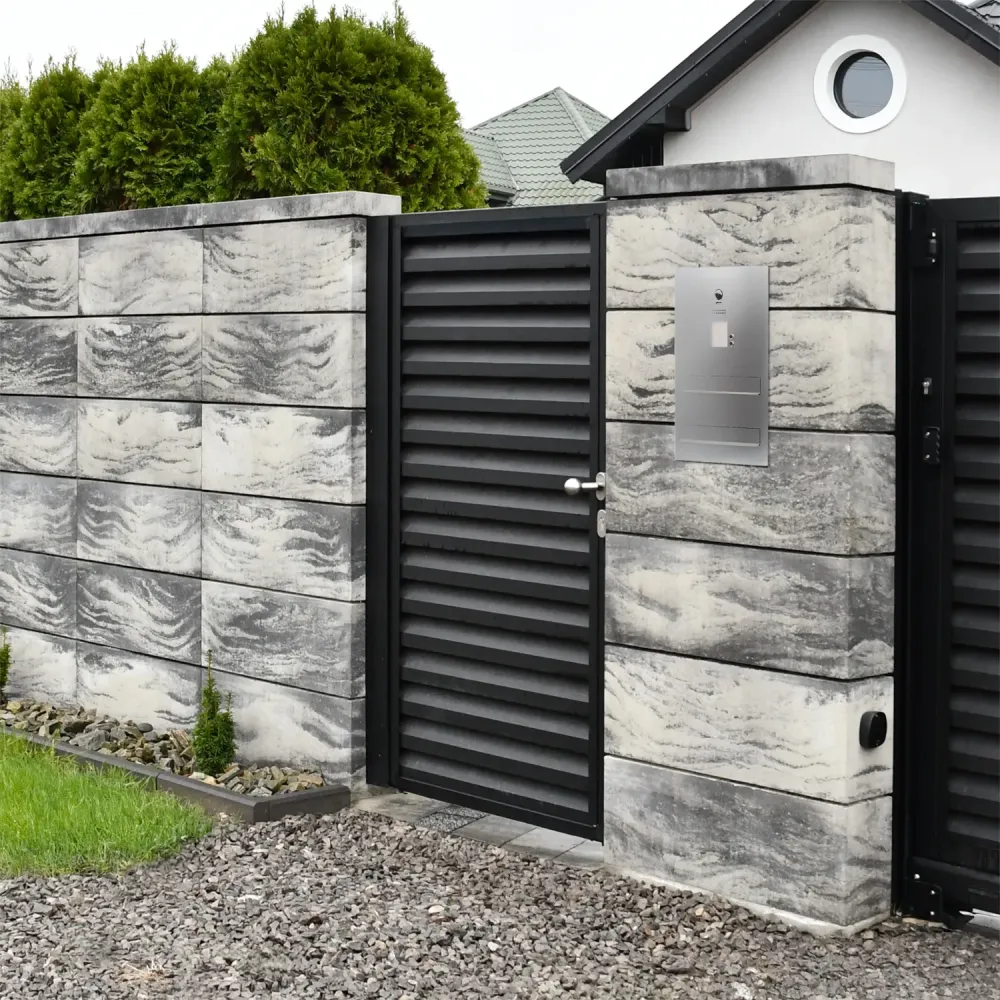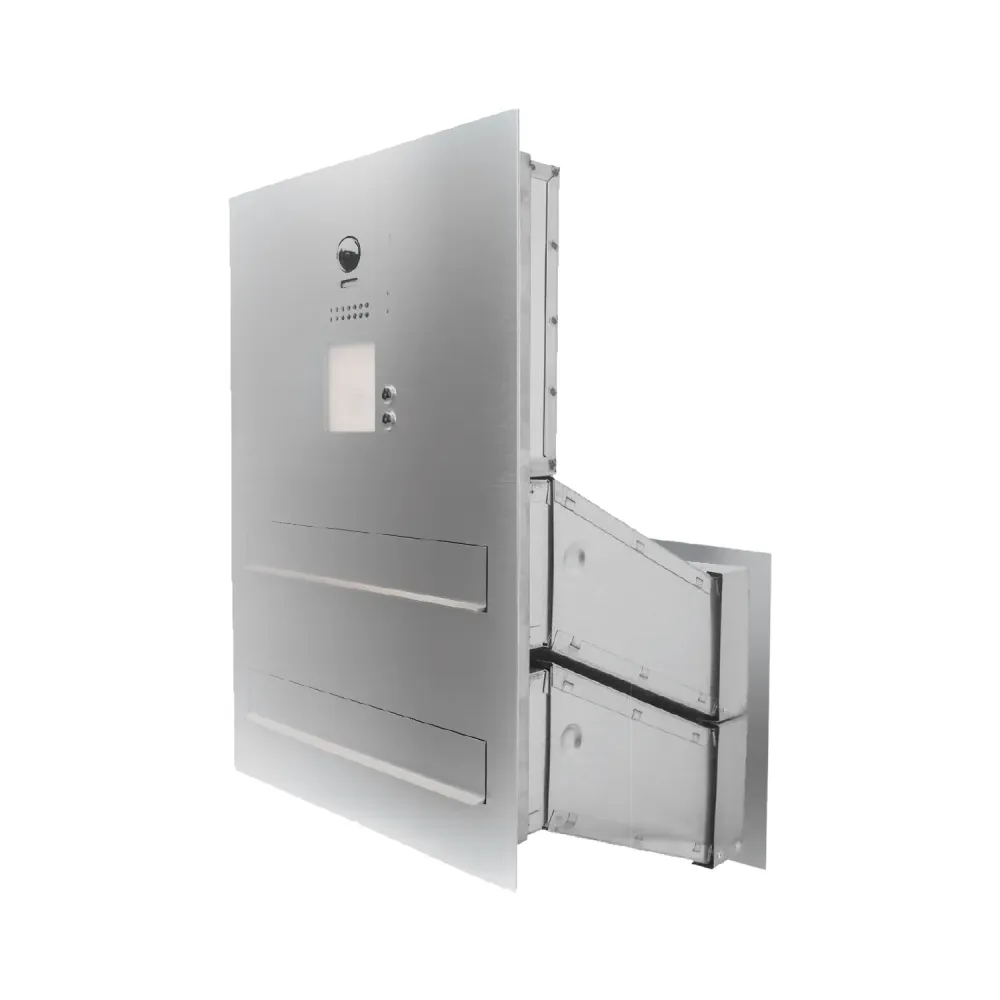 Podwójna przelotowa skrzynka na listy z wideodomofonem i czytnikiem RFID do montażu w bloczkach ogrodzeniowych i murach o głębokości od 26 do 41 cm.