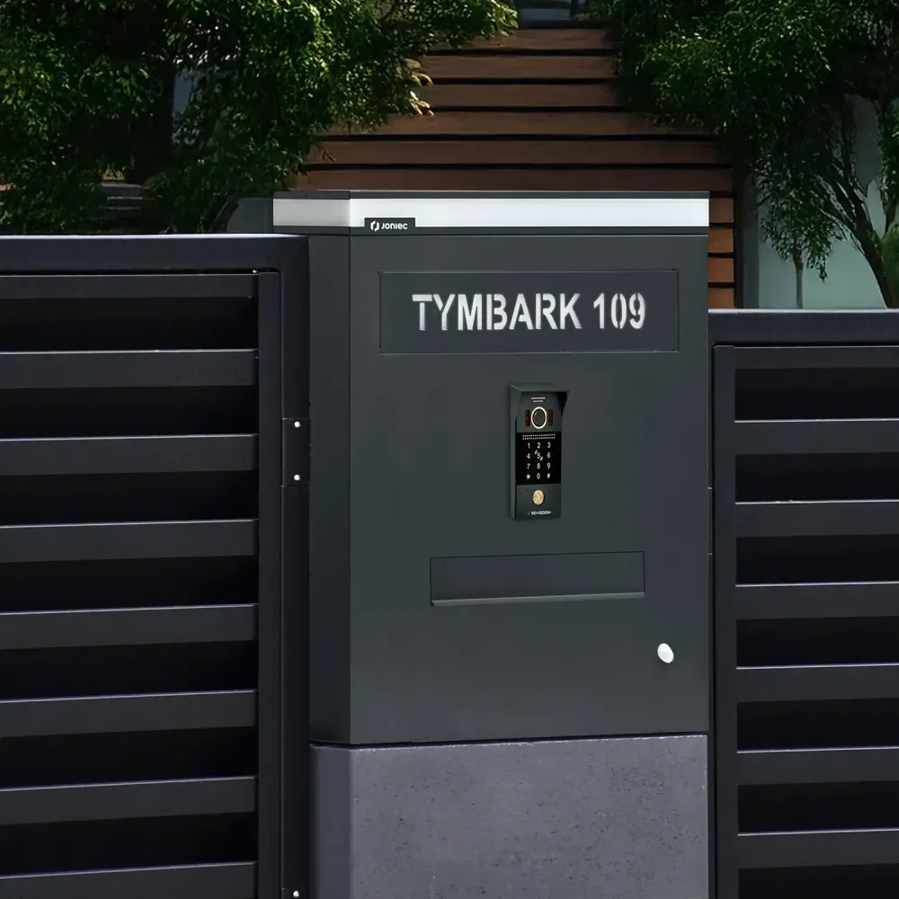 Powyżej otworu wrzutowego na ściance frontowej umieszczone jest podświetlane pole adresowe z możliwością personalizacji poprzez wycięcie nazwy ulicy/miejscowości oraz numeru domu. Ostatnim elementem znajdującym się pomiędzy wrzutką na listy, a polem adresowym jest wideodomofon z kamerą o szerokokątnym obiektywie 2 Mpx/ 1080P o kącie widzenia 120° w poziomie oraz 60° w pionie gwarantujący dokładną kontrolę strefy wejścia. Zlokalizowany na panelu podświetlany przycisk ułatwia wywołanie monitora w warunkach ograniczonej widoczności np. w nocy. Różne kolory podświetlenia sygnalizują obecny stan urządzenia tj. czuwanie, wywołanie, nawiązanie połączenia i odblokowanie wejścia.